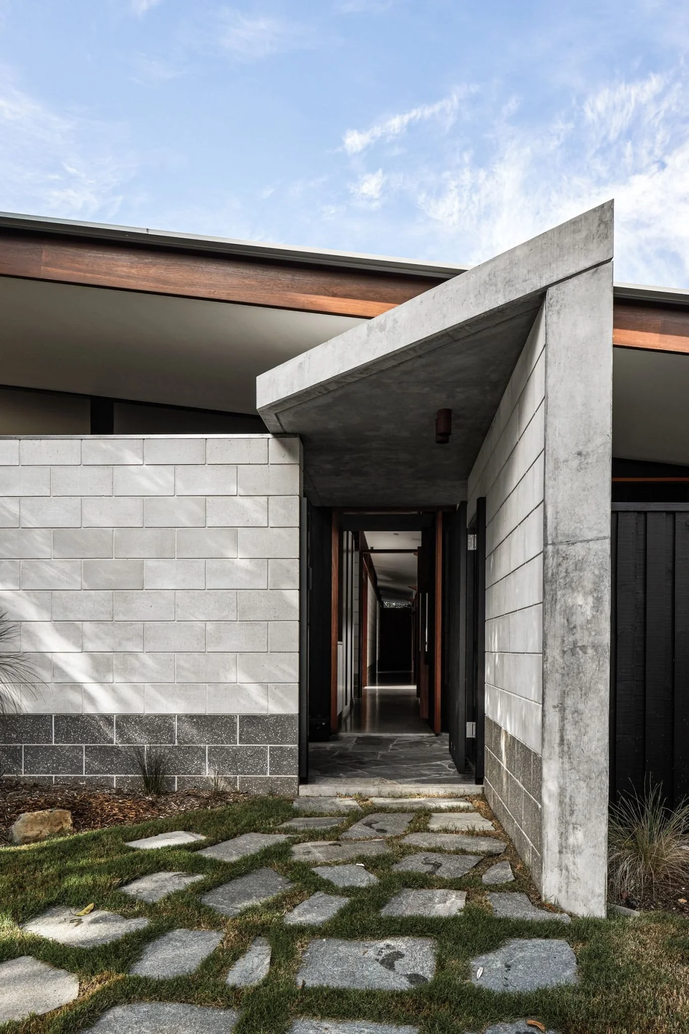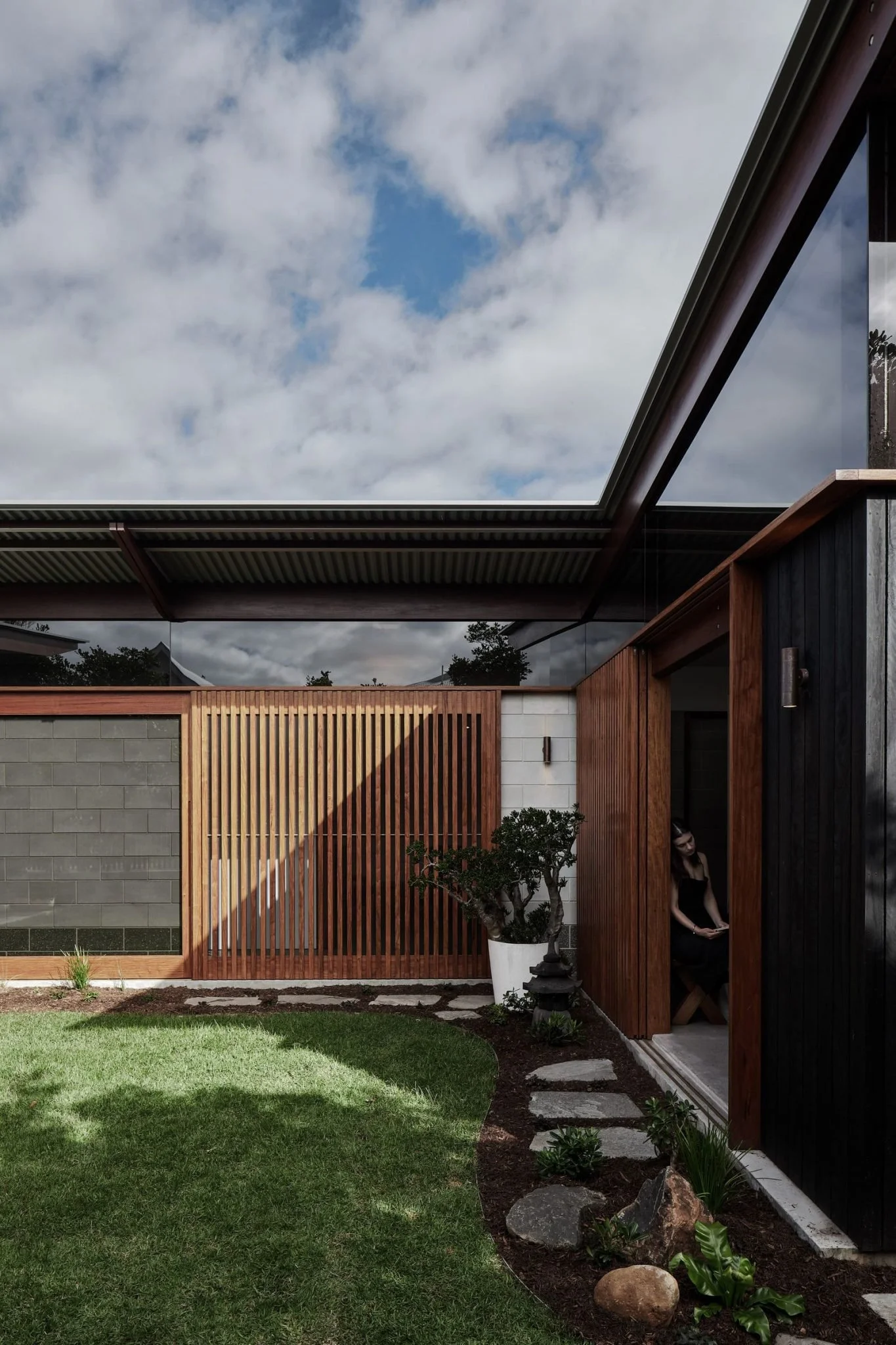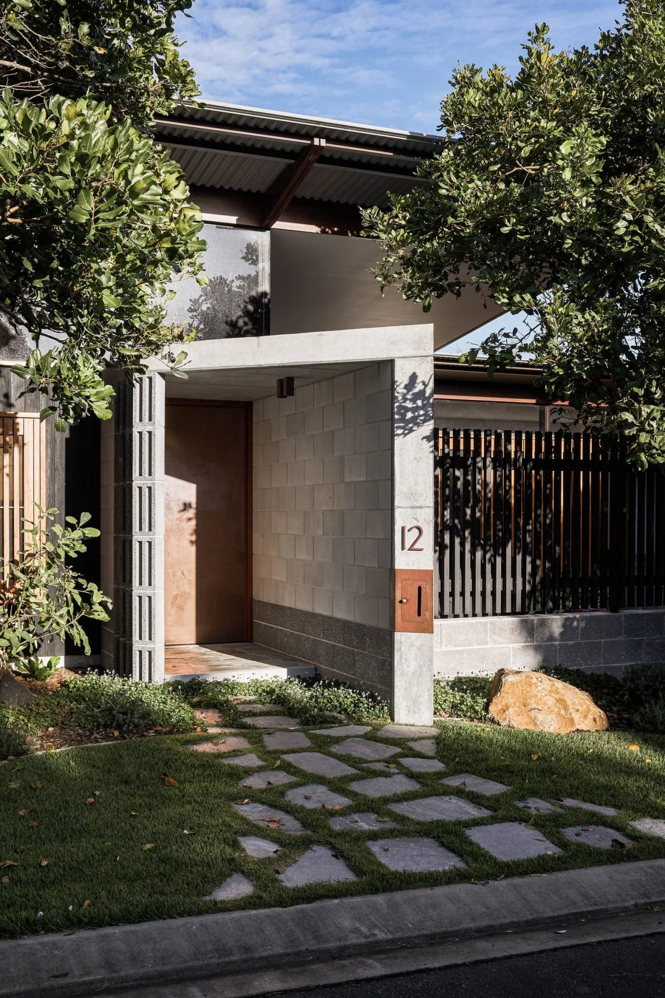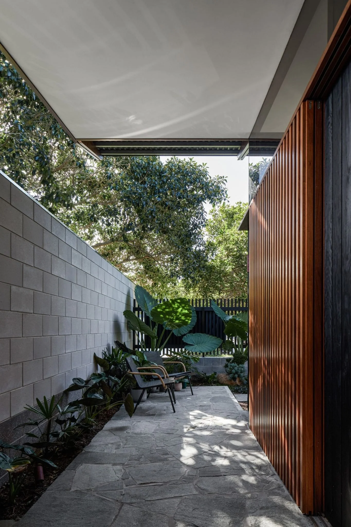 Hardscape elements such as EcoOutdoor Endicott crazypave, blockwork, hardwood timber batten privacy screens allow the home to patina beautifully as well as heightening a connection to coastal life.